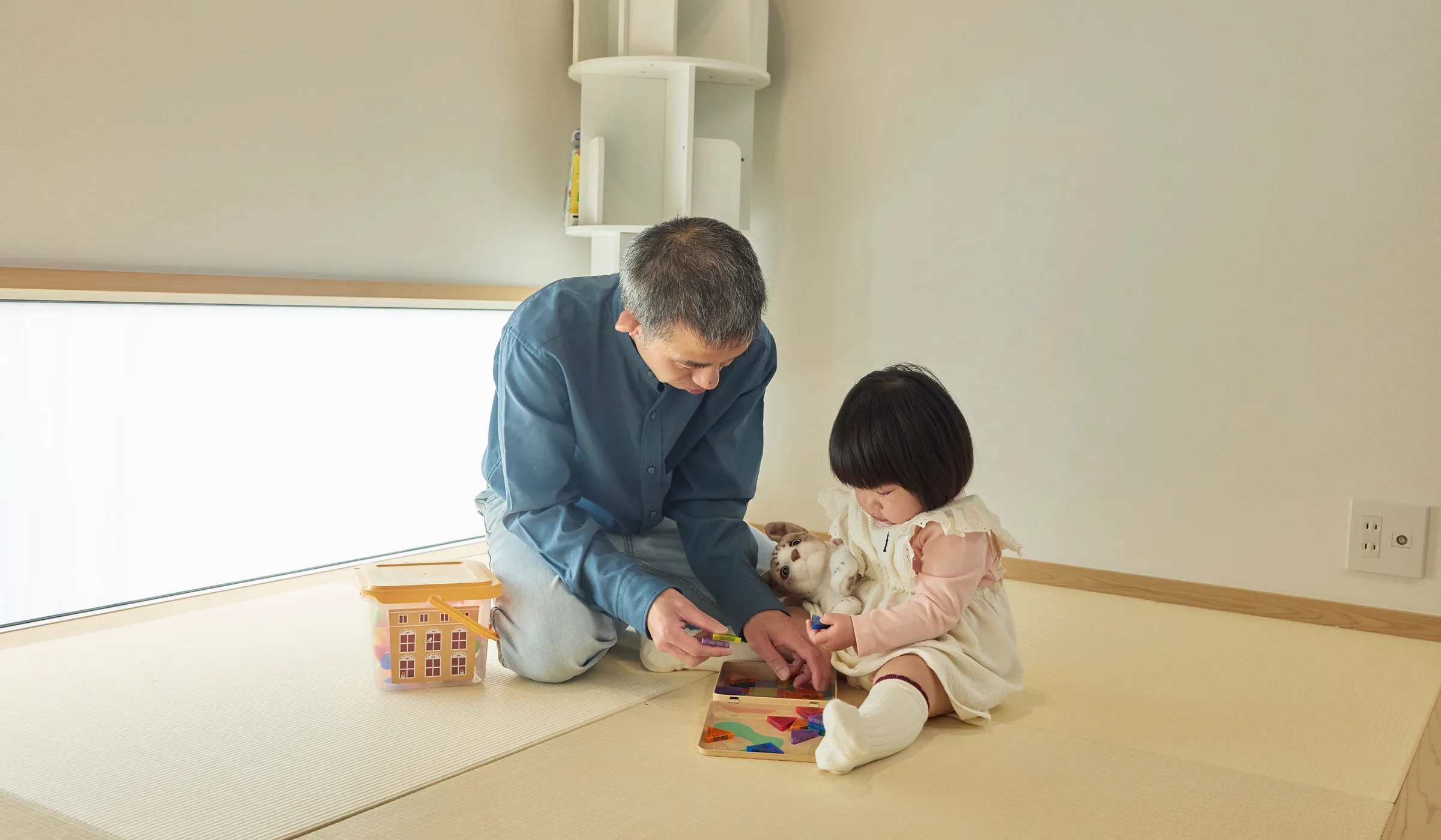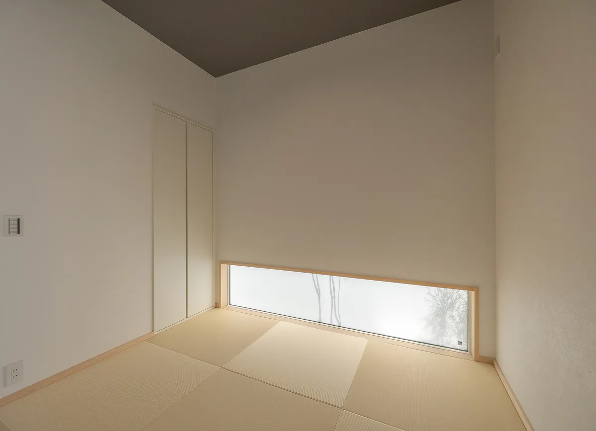 実際に暮らしてみて、一番実感しているのが畳の重要性。最近、和室がない家が増えていると聞きますが、畳があってよかったなとありがたく感じています。というのも、子どもがちょっとくらいこけても気にならないですし、昼寝したり、着替えさせたり、畳があるからスムーズにできることっていっぱいあるんですよね。この畳コーナーの配置もいいです。リビングの一角にあって、この畳の上では子どもがおもちゃを広げてもOKということにしているので、他の場所におもちゃが散らばらない。収納スペースもあるのでスッキリ片付けることができます。それに、この畳スペースにあるすりガラスの窓がとっても素敵! 光が入るだけでなく、植栽の葉っぱが影絵のようになって、ひらひらと舞っているように揺れることもあり、とっても幻想的で心がなごみます。