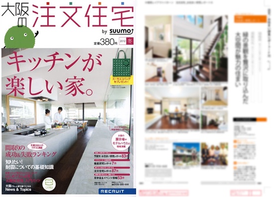 2011年11月21日にリクルートから発売になった「大阪の注文住宅2012冬bySUUMO」に、当社の物件が2件掲載されています。秋に完成した藤井寺(134ページ)と東住吉区(342ページ)のお宅です。