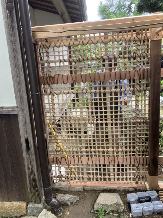 これが以前の塀の木舞の実物。皆で編み方を研究。