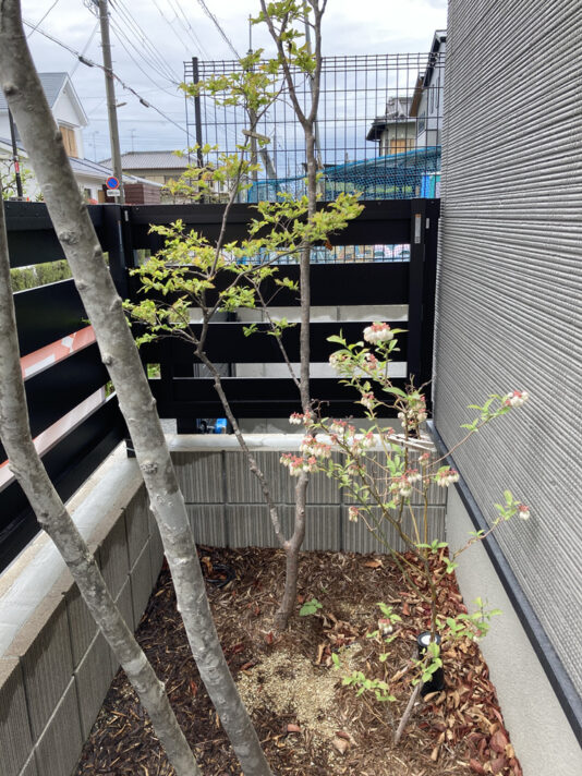 玄関横の「ブルーシャワー」はピンク色の花びら