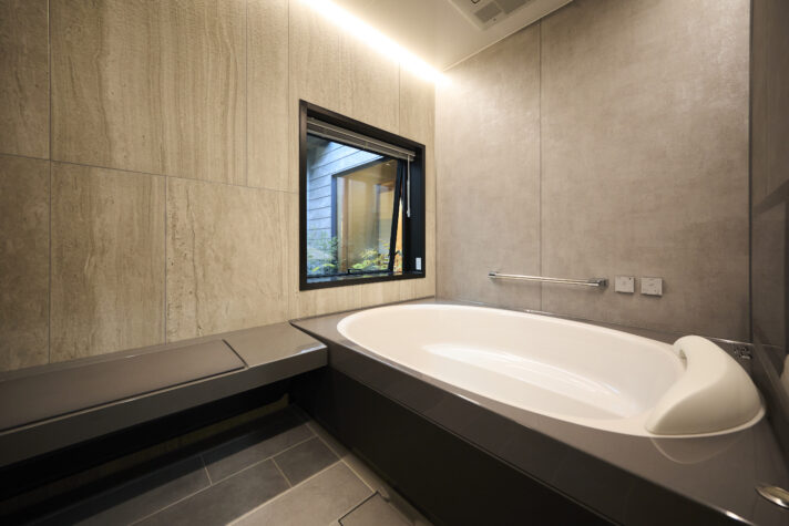 広々と確保した浴室の窓からは、丁寧に作り込まれた中庭の植栽を眺めることができます。