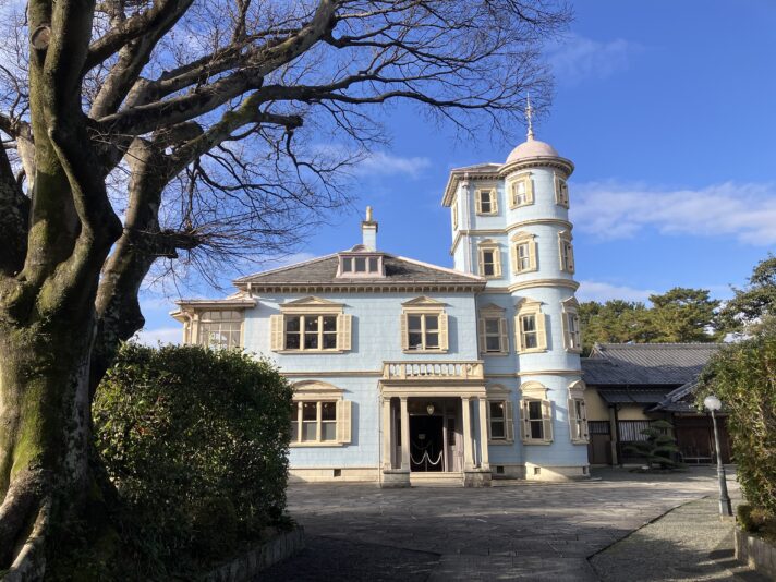 洋館を見るとかわいい水色の外壁と4階の塔が目につきます。